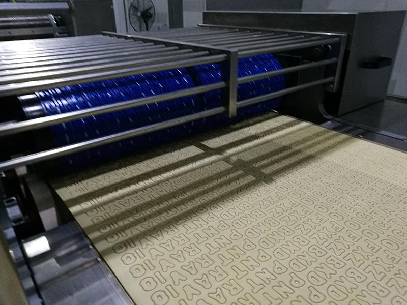 Después del corte rotativo / moldeo rotativo, transfiera las piezas de masa a la correa de malla del horno.