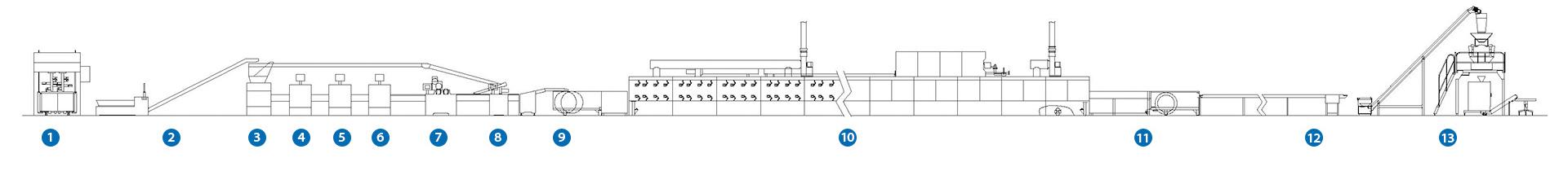 Después del corte de las láminas de masa, los excedentes son tomados por un rodillo en la parte exterior y se transportan a la tolva del laminador donde se reutilizan para crear nuevas capas de masa para nuevos procesos de corte.