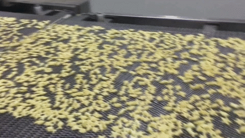 Después del corte de las láminas de masa, los excedentes son tomados por un rodillo en la parte exterior y se transportan a la tolva del laminador donde se reutilizan para crear nuevas capas de masa para nuevos procesos de corte.